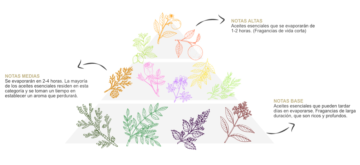 Los aceites esenciales se pueden categorizar según el tiempo que tardan en evaporarse: