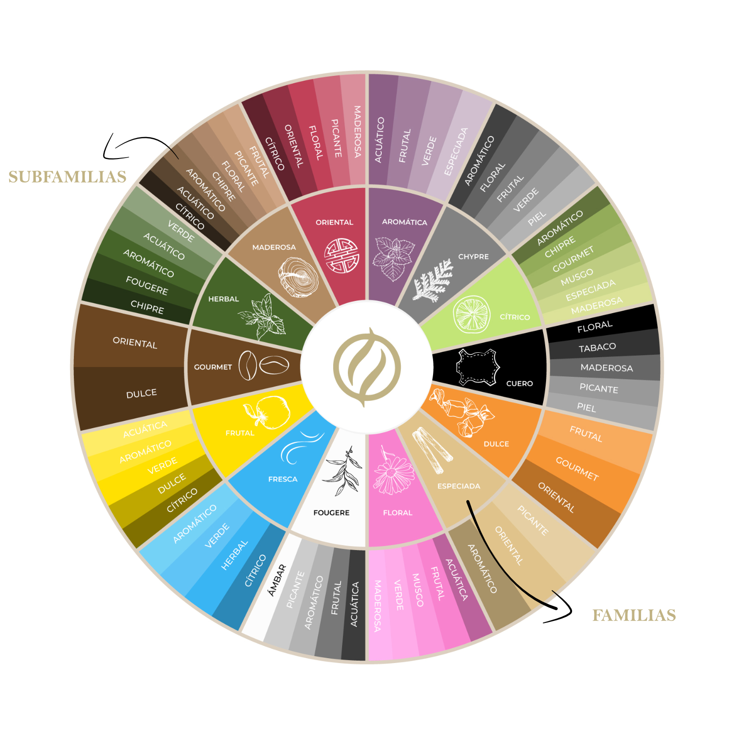 Dentro de nuestra extensa gama de fragancias éstas se clasifican en 14 familias olfativas, cada una en particular con una estructura piramidal aromática distinta segmentada por la Nota de Salida, Corazón y Fondo. A continuación, se describe a detalle cada una de ellas.